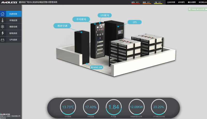 本項目使用安德力士UPS不間斷電源(yuán)係統3套(tào)(1套GLS-300KVA模塊化(huà)UPS、1套GLE-100KVA工頻UPS、1套GLE-40KVA工頻UPS)、動力環境監測(cè)係統3套、精密(mì)空調2套,為用戶單位信息化建設提供保障。